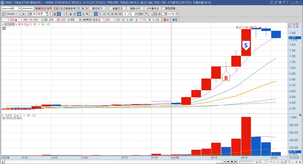 - 7500원대까지 목표가를 봤었는데.. 오전 30분 매매에 대한 시간적 압박으로 우선 수익줄때 먹자고 매도함. ㅠ.ㅠ