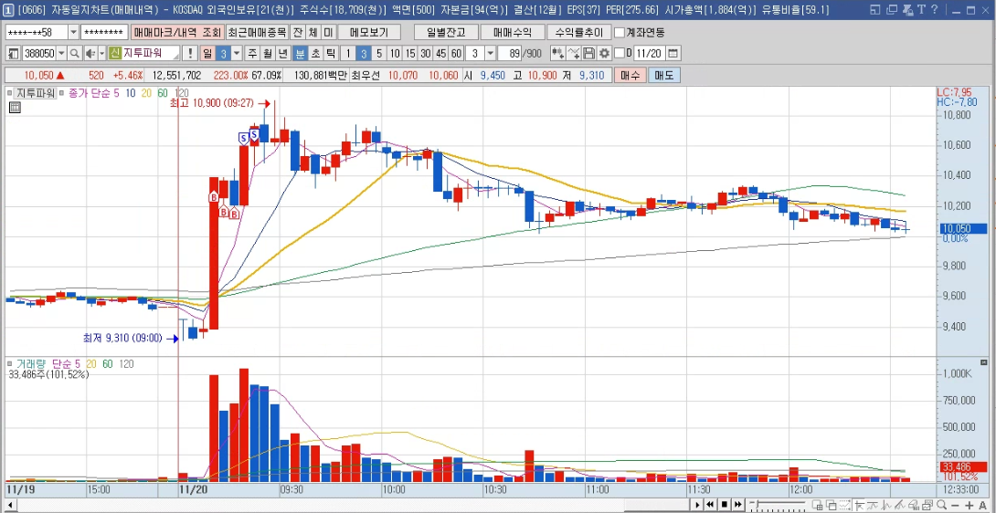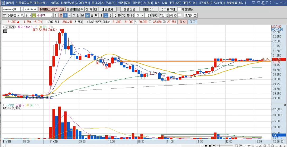 - 매도는 아마도 일봉에 윗꼬리 고점 절반에 매도 했습니다.