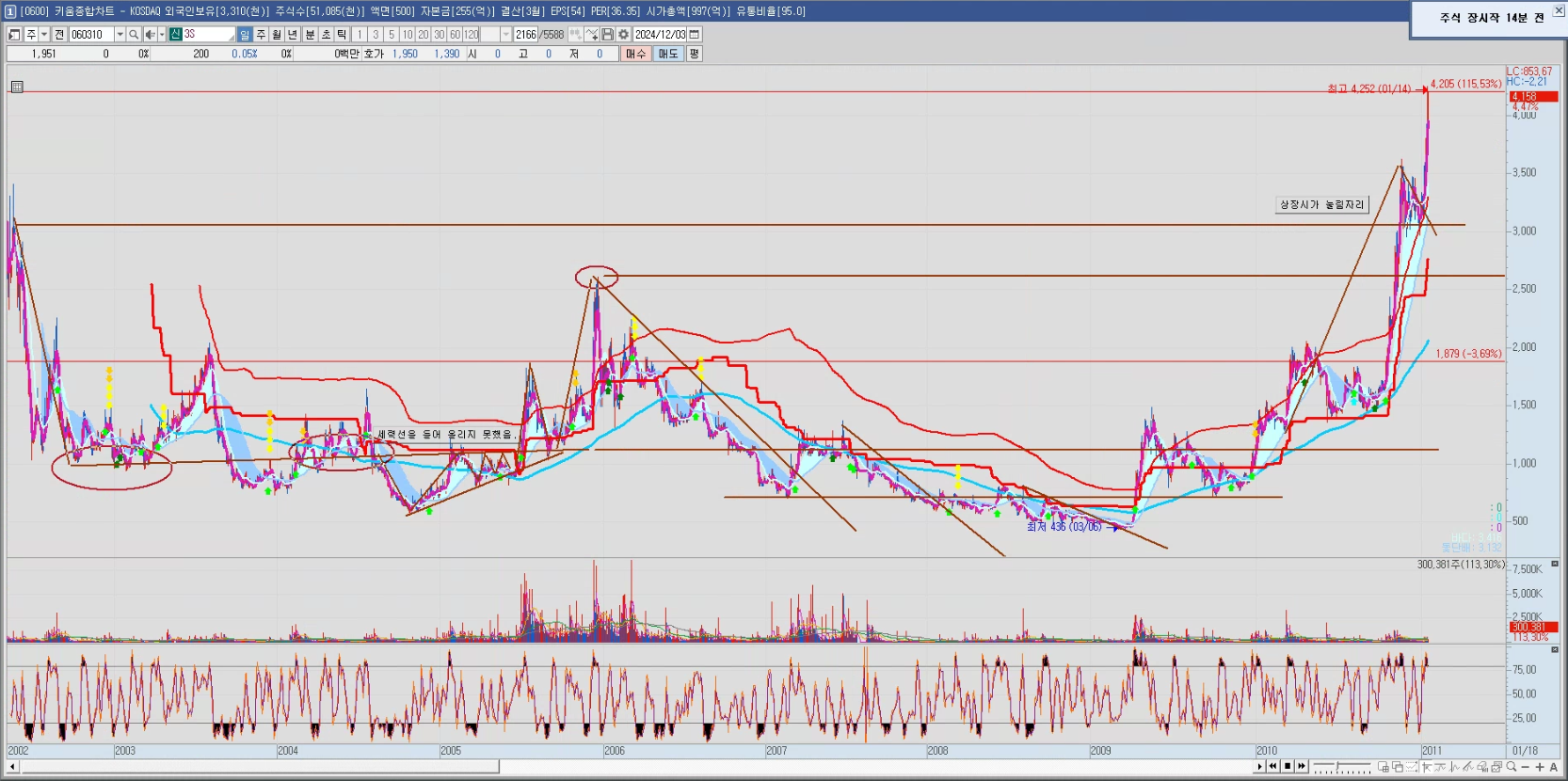 - 2009년 대상승전 - 컵핸들 자리 이후 3,000% 상승