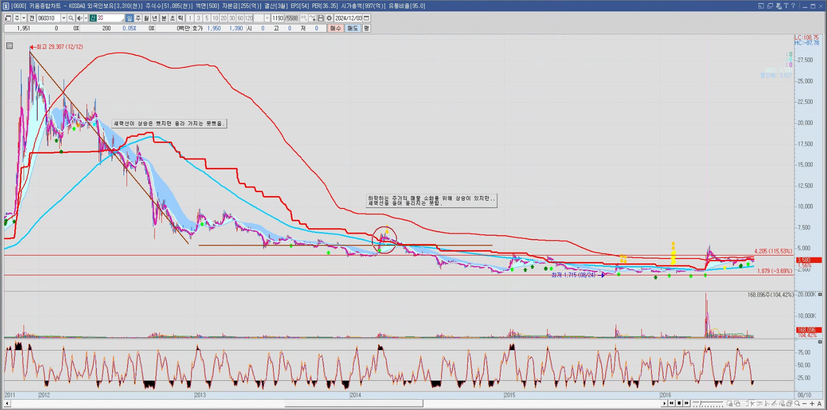 - 2016년 하락 멈추는 자리 - 세력선을 들어 올리면서 하락 추세가 멈췄다(?)