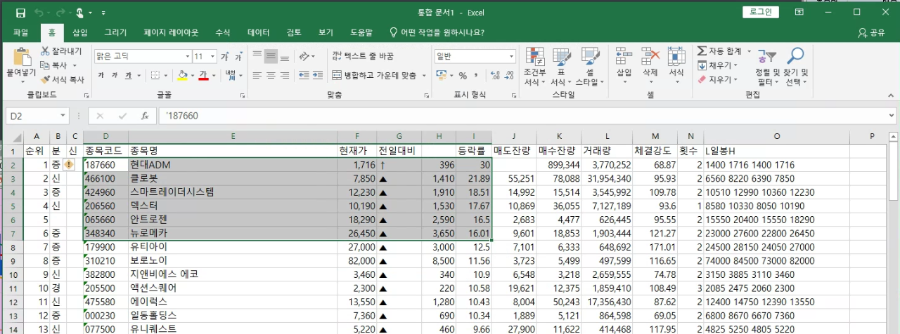 만들어진 자료를 기준으로 15%이상의 종목을 드래그 하여 복사하여 붙여 넣기 합니다.