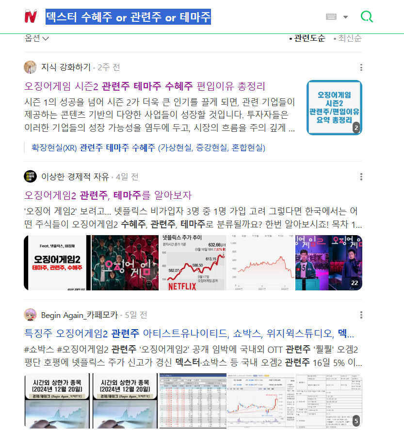 우선은 좀더 명확한 테마 검색을 위해서.. "덱스터 수혜주 or 관련주 or 테마주" 검색해봅니다.