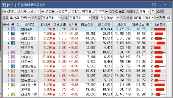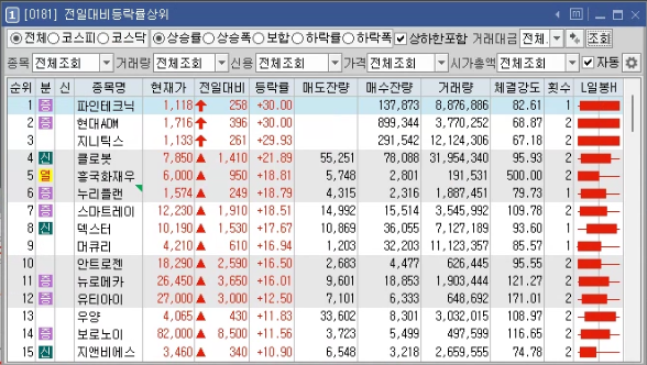 키움증권 기준으로 "[0181] 전일대비등락률상위" 등락률 기준으로 해서 15%이상의 조건을 보겠습니다.